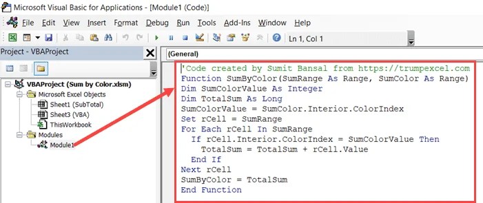 'Code created by Sumit Bansal from https://trumpexcel.com/ 'This VBA code created a function that can be used to sum cells based on color Function SumByColor(SumRange As Range, SumColor As Range) Dim SumColorValue As Integer Dim TotalSum As Long SumColorValue = SumColor.Interior.ColorIndex Set rCell = SumRange For Each rCell In SumRange If rCell.Interior.ColorIndex = SumColorValue Then TotalSum = TotalSum + rCell.Value End If Next rCell SumByColor = TotalSum End Function